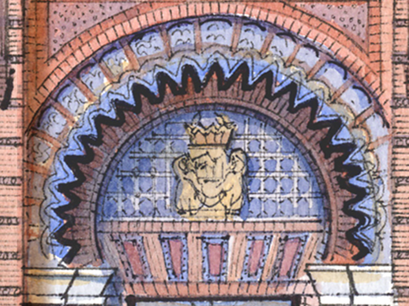 An Evening Beneath the Arches is a 12x16 limited edition, signed art print created by architect/artist Kurt Xu. This architectural cityscape captures the warm glow of evening light as it settles over grand arches, historic towers, and lively streets below.