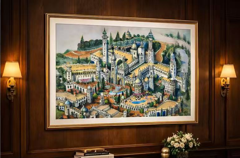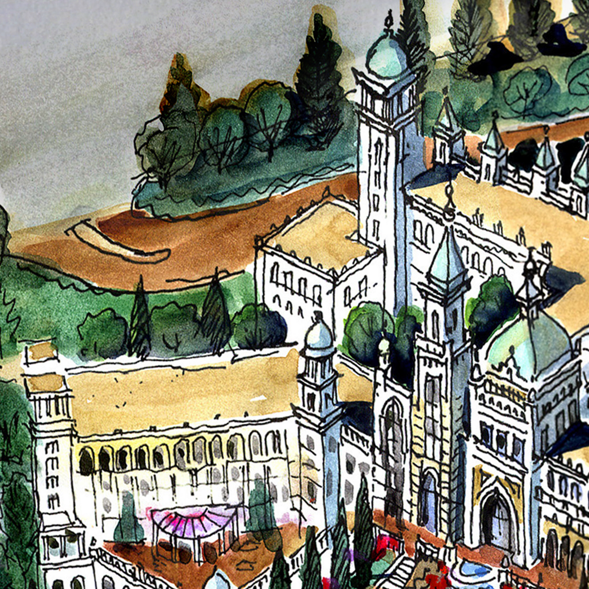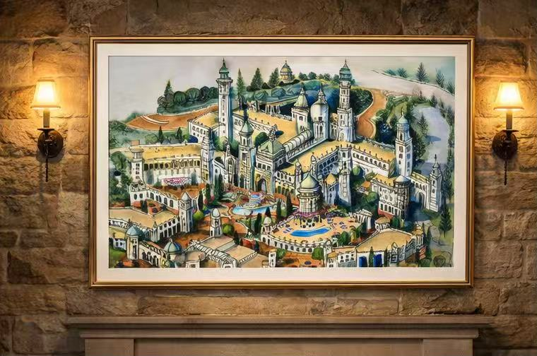 The artwork blends warm earth tones with cool greens and blues, creating depth, movement, and visual storytelling. From above, the composition feels both monumental and intimate—celebrating the elegance of human design and the timeless beauty of place.