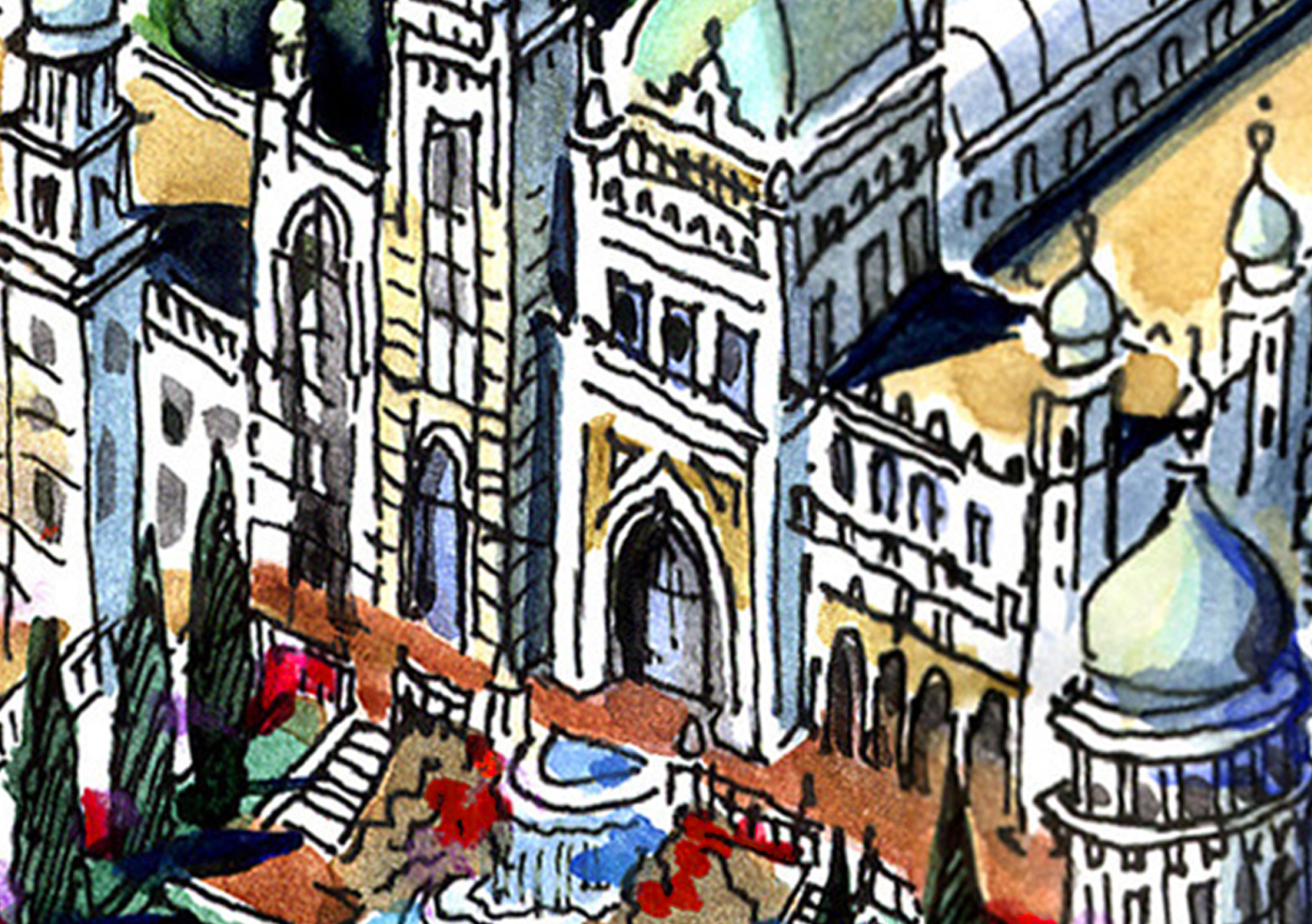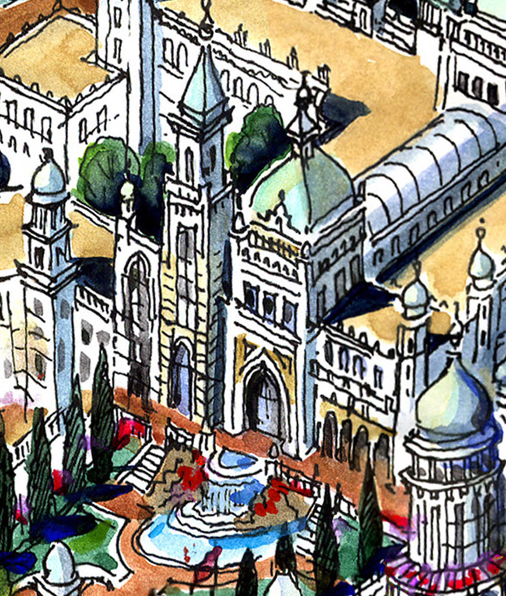 Style: Architectural illustration / Cityscape art / Aerial view artwork