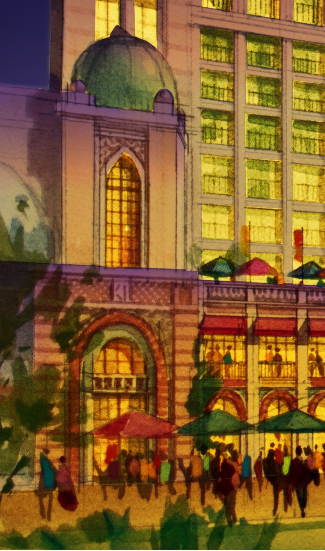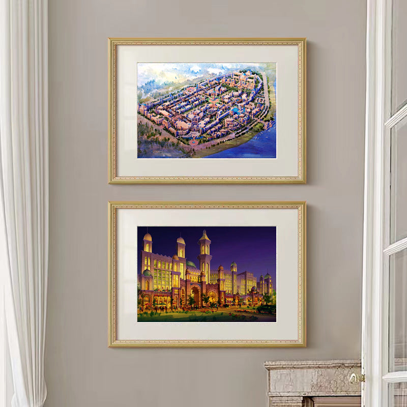 Dreams Beneath the Domes is a limited edition signed fine art print by architect/artist Kurt Xu, capturing a luminous architectural cityscape glowing beneath a twilight sky.