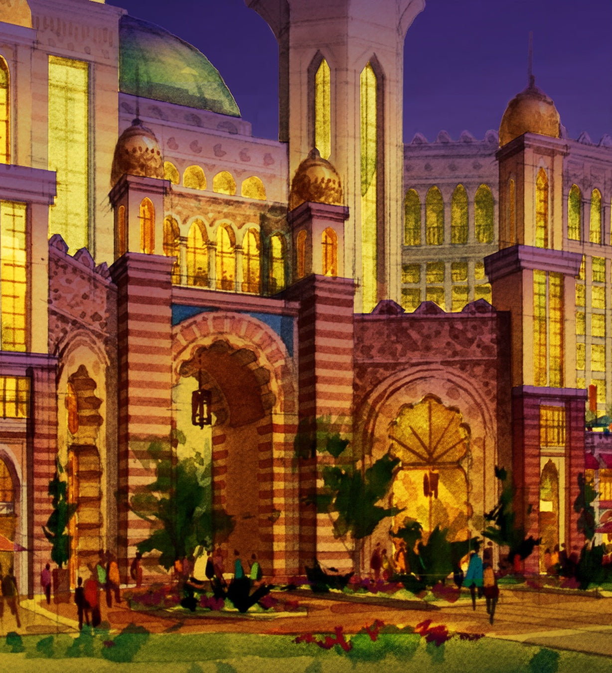 This enchanting composition features radiant domes, towering arches, and elegant palaces illuminated in warm golden light. The nighttime setting transforms the city into a dreamlike vision—where architecture becomes poetry and light becomes its language. The scene invites viewers into a world shaped by imagination, culture, and timeless design.
