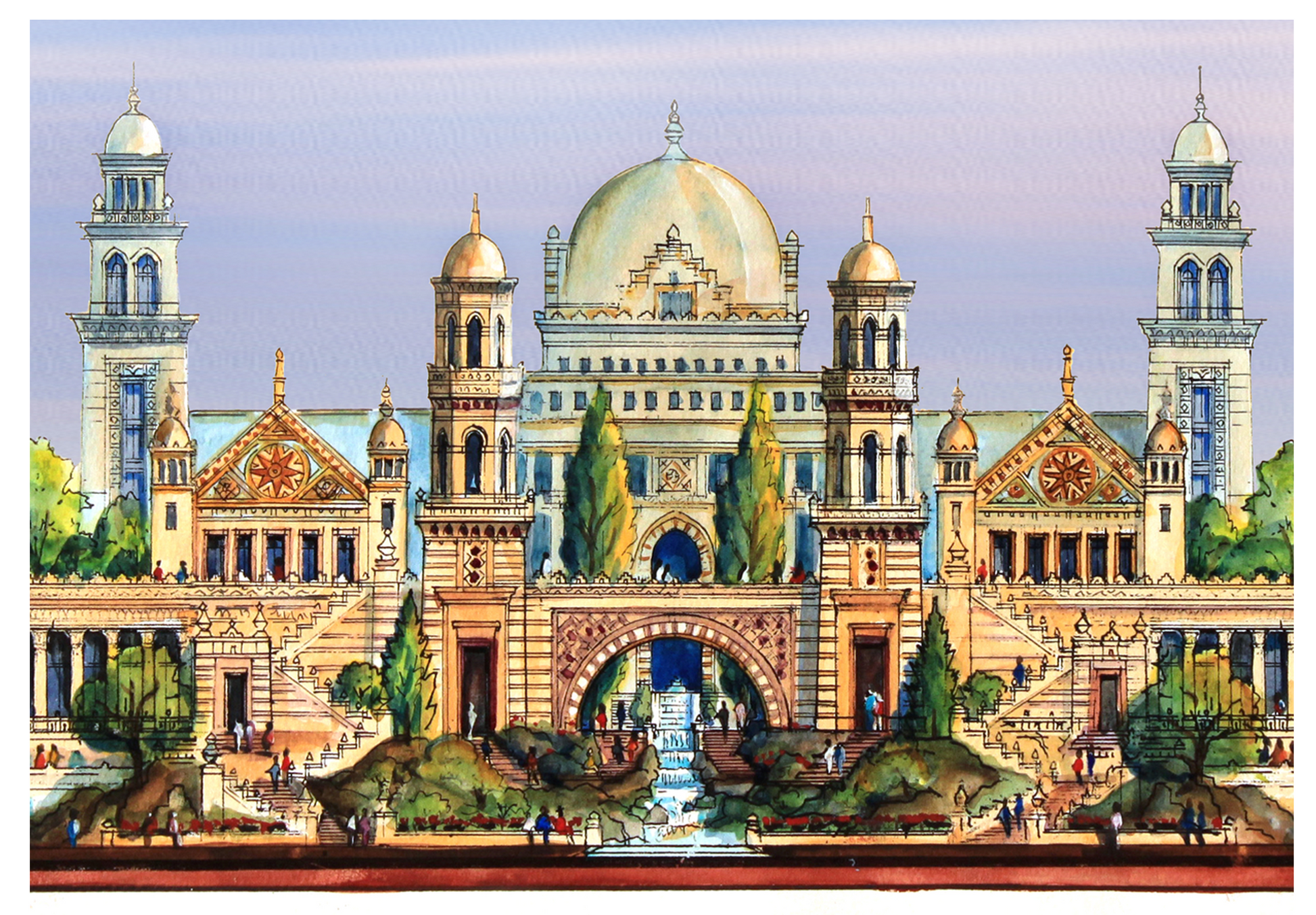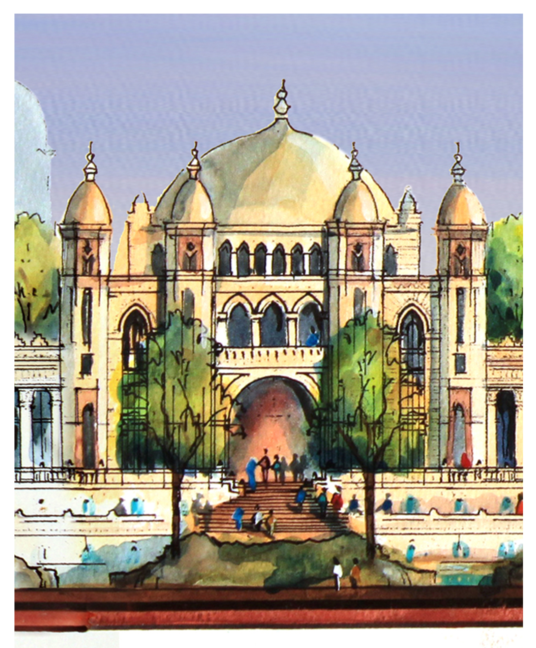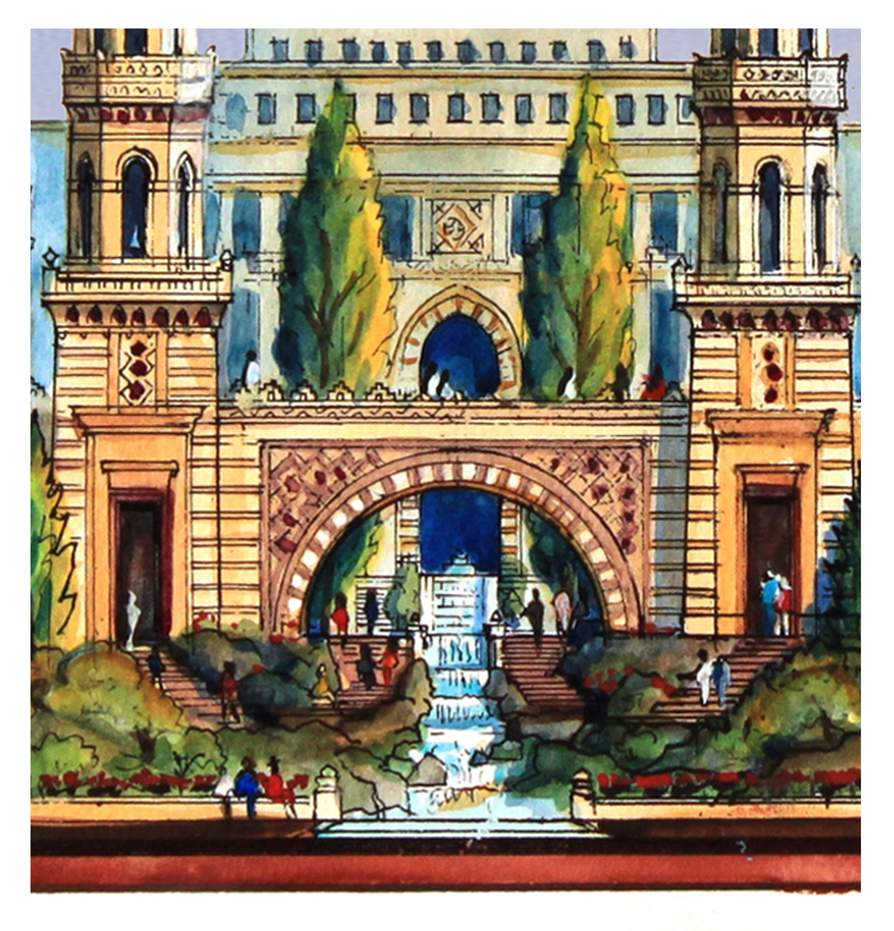 Dreams of the Golden Kingdom – Color Edition is a limited edition signed fine art print by architect/artist Kurt Xu, presented in a striking panoramic format that celebrates the grandeur and imagination of a legendary architectural cityscape.