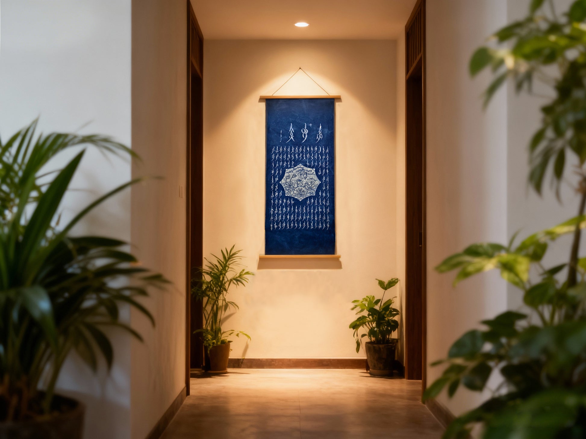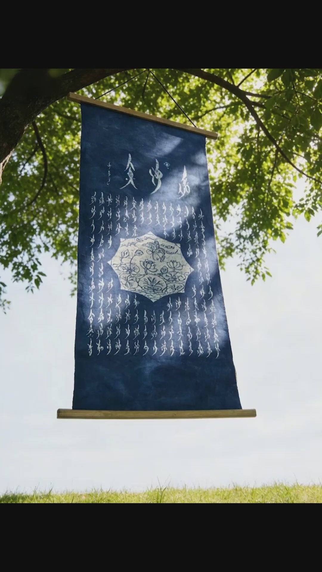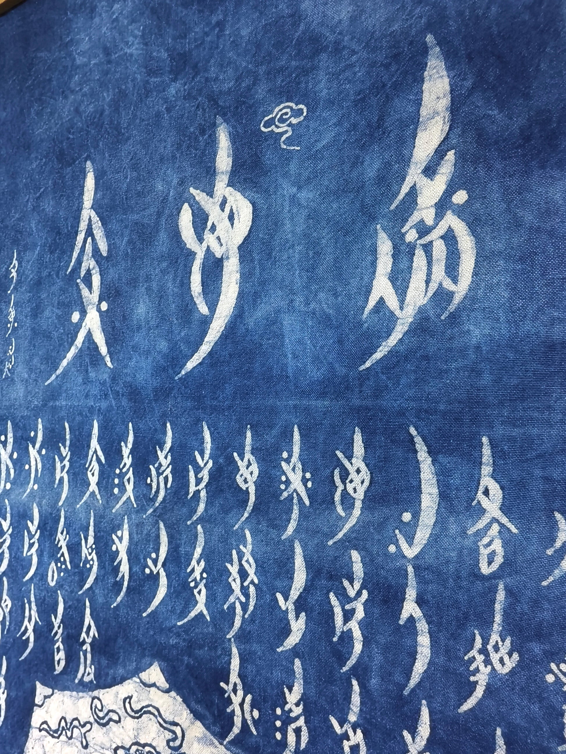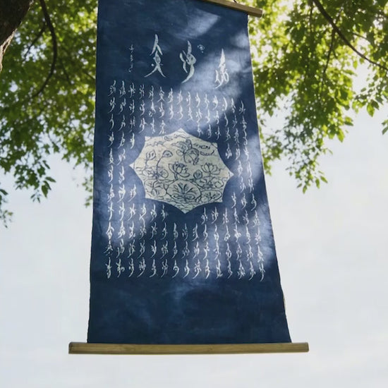 This 18” x 36” handmade indigo batik wall hanging brings together two powerful legacies of Chinese cultural history: the moral philosophy of the lotus and the hidden literary voice of women.
