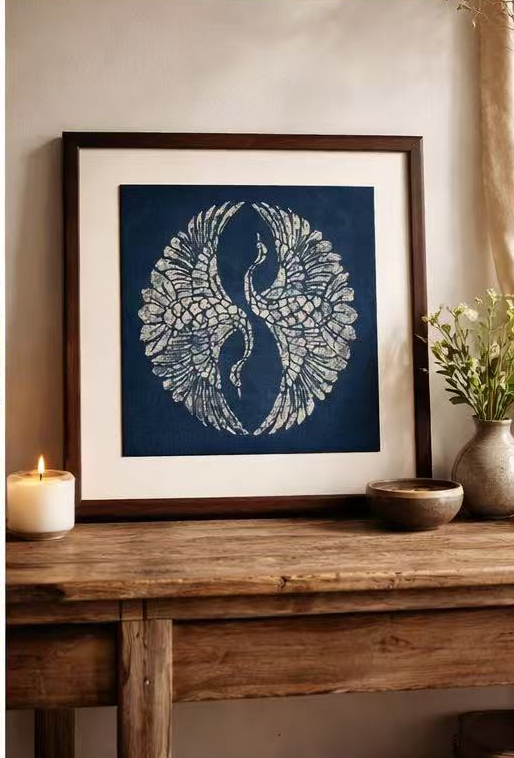This indigo-dyed piece presents cranes in a Tai Chi pattern, symbolizing the balance between freedom and heritage in modern life.
