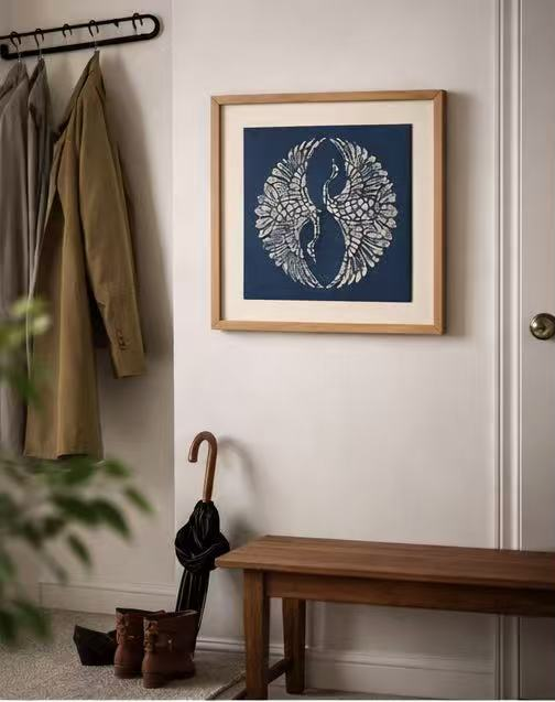 Adopting the craft language of indigo dyeing, the work uses the tranquil indigo background to carry the pure white lines of crane feathers, reconstructs the image of two cranes in the form of a Tai Chi diagram, and presents the life cycle of yin-yang symbiosis on the indigo background. The crane feathers spread like wings, with their heads and tails connected, implying the dual aspects of modern people - seeking spiritual balance and freedom between breaking free from constraints and guarding inheritance.