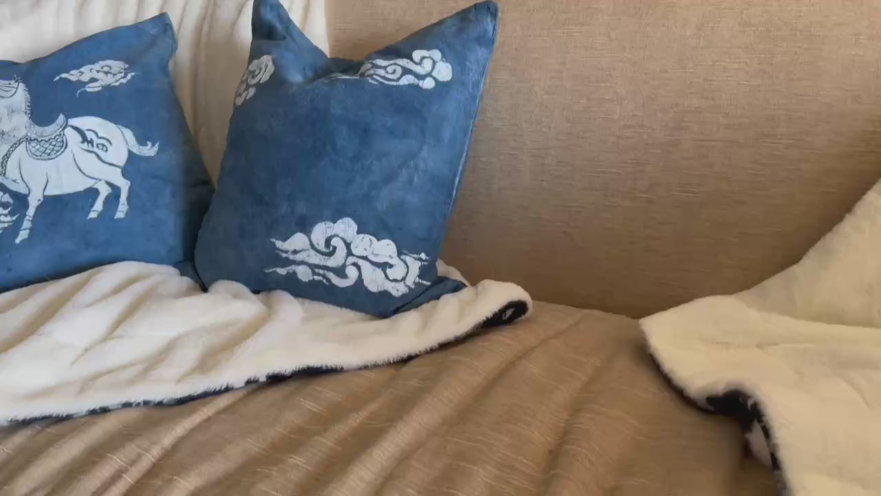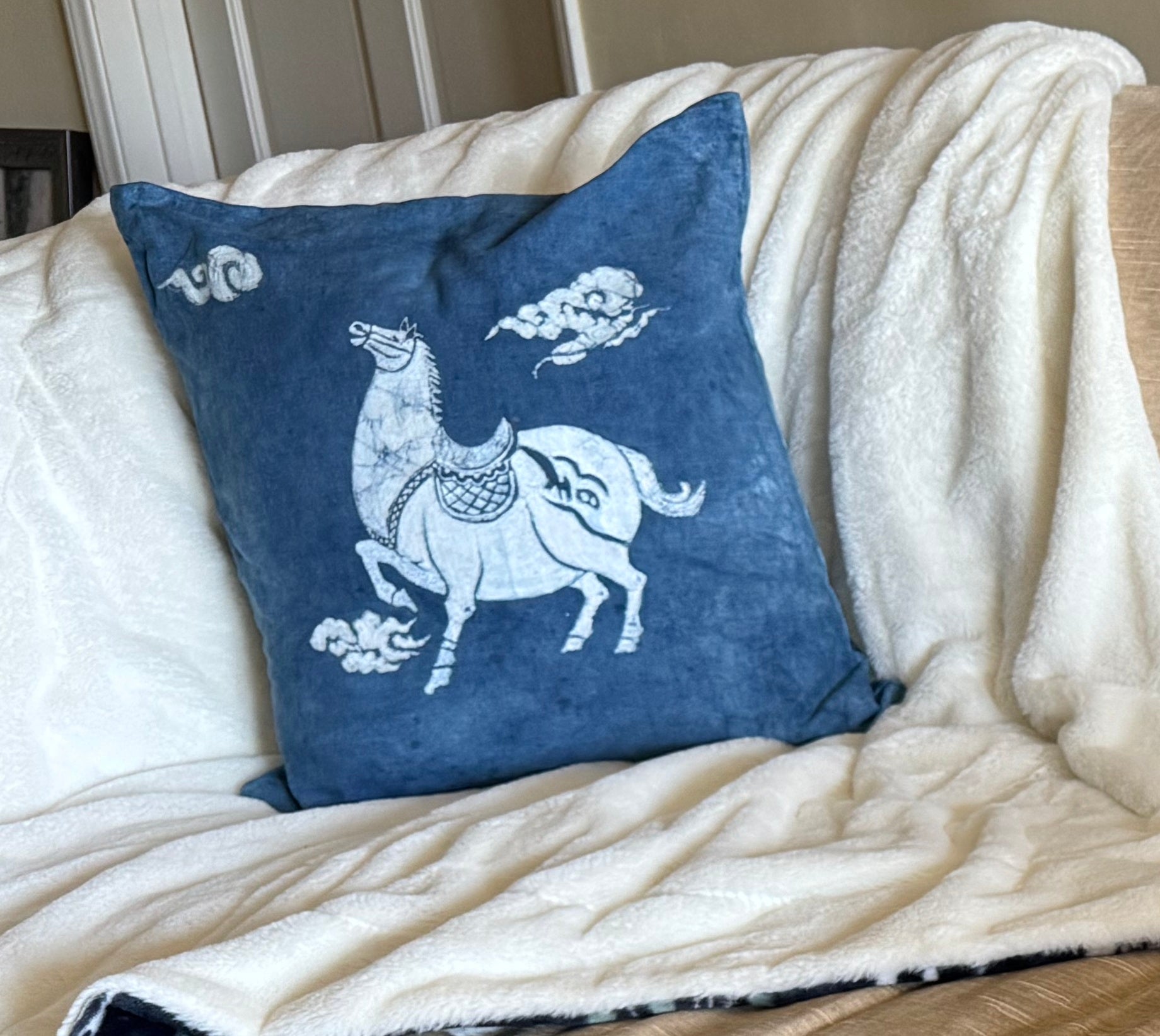 This 18 x 18 inch cushion cover is handcrafted using traditional batik techniques on rich indigo blue cotton canvas. The front features a beautifully detailed white horse surrounded by flowing cloud motifs. The back showcases coordinating cloud batik patterns for a complete, finished look.