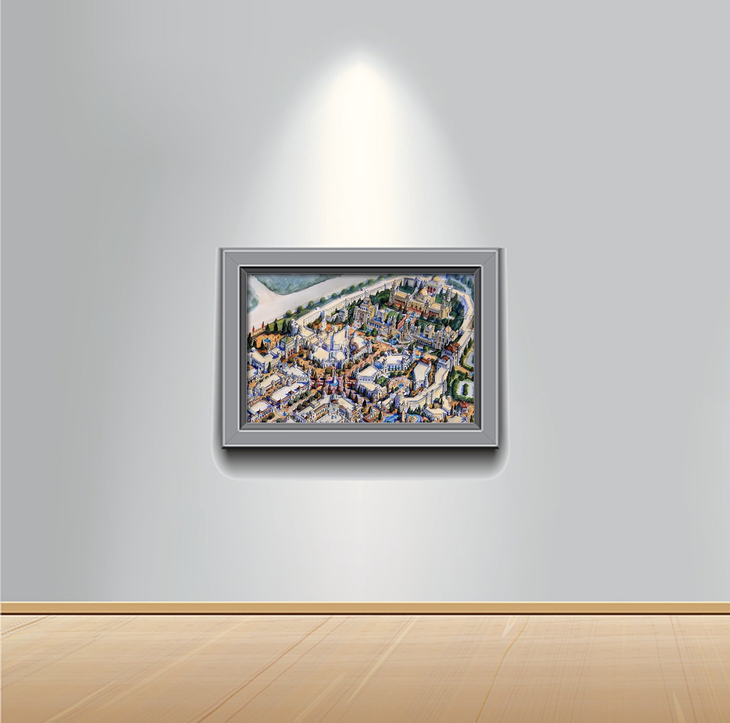 Where Empires Sleep is a limited edition signed fine art print by architect/artist Kurt Xu, capturing a breathtaking aerial view of an ancient city where history, architecture, and human life intertwine. This intricate architectural cityscape illustration invites viewers to explore a world of winding streets, grand towers, courtyards, and waterways—each detail telling a story of civilizations that once flourished and continue to inspire.