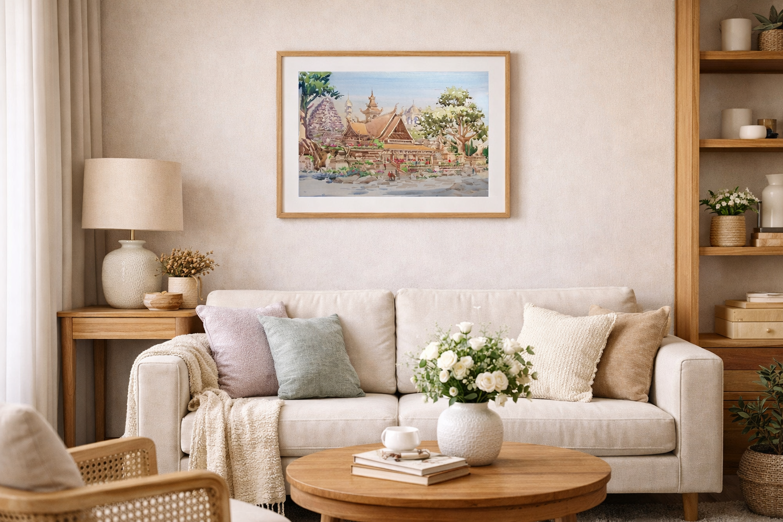 This artwork pairs beautifully with natural wood tones, soft neutrals, and airy spaces—bringing a sense of calm, culture, and quiet elegance wherever it’s displayed.