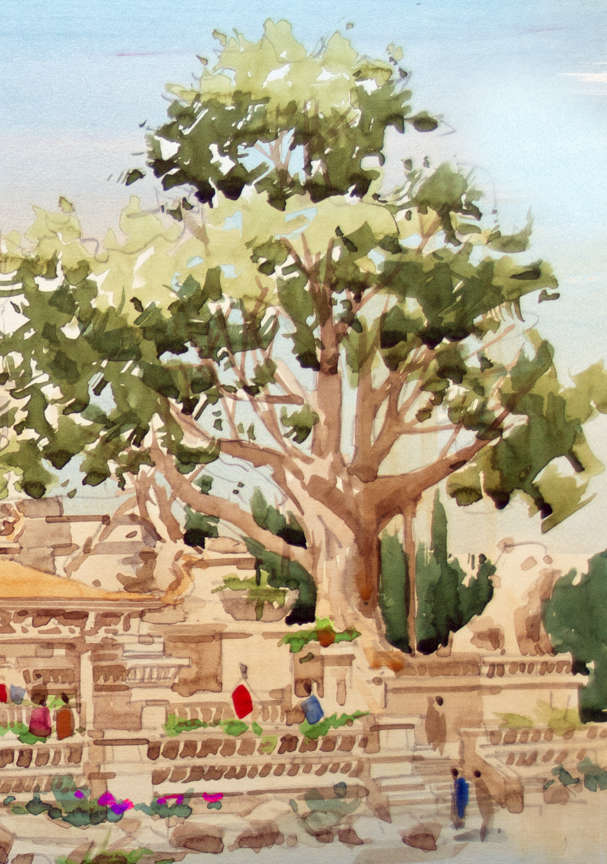 Where the Temple Breathes is a limited edition signed art print by architect/artist Kurt Xu, capturing a serene architectural landscape where history, nature, and quiet human presence coexist. Rendered in soft watercolor tones, the scene invites the viewer into a timeless space—sunlit stone pathways, delicate florals, and layered temple structures that feel both grounded and dreamlike.