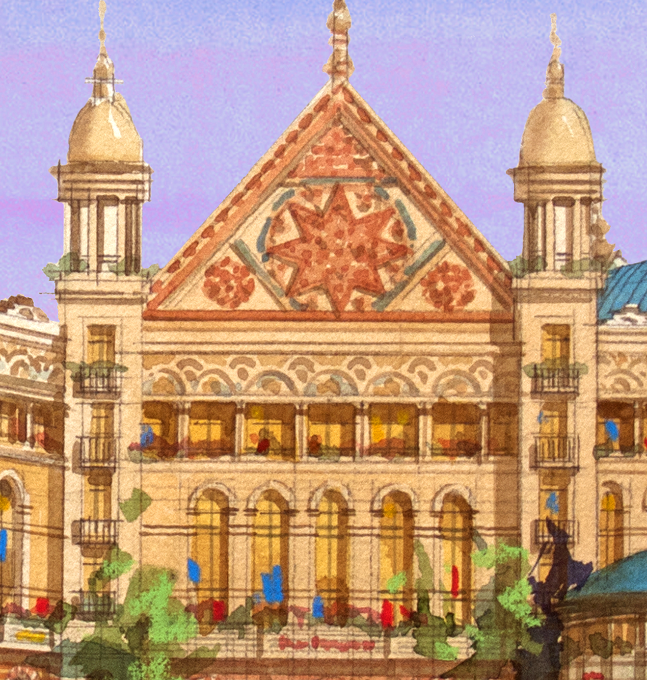 This architectural watercolor captures the romance and energy of a historic European square — where golden domes, arched gateways, and vibrant city life meet under a softly painted sky.